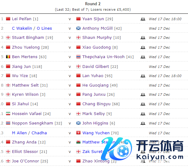 第一轮终末一个出场的是中国香港选手王雨晨,他在与新科北爱尔兰公开赛冠军“小司机”杰克-利索夫斯基比赛中超水平证实,总比分4-1爆冷晋级。至此体育集锦,晋级32强的中国选手达到14名,险些占到半壁山河,祝愿他们!