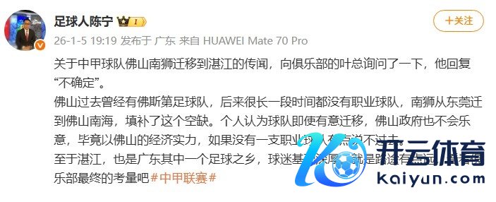 1月5日讯 媒体东说念主陈宁社媒发文谈中甲球队佛山南狮迁徙到湛江的据说,称俱乐部高层表露现在还不细目。