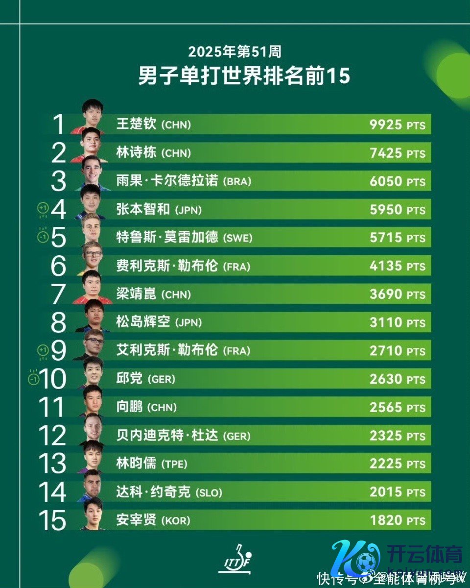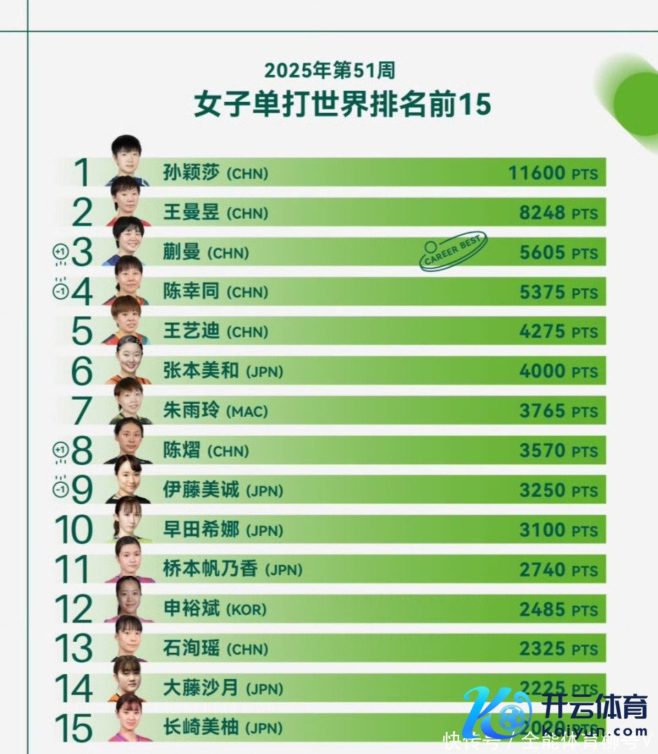 可惜因为受伤无缘争夺男女单打冠军,总决赛截止后,国外乒联2025年第51成全国排行火热出炉,中国女将包揽前五位:孙颖莎以11600分的积分,紧紧占据全国第一宝座。刚刚夺得WTT香港总决赛女子单打冠军的王曼昱排在第二。
