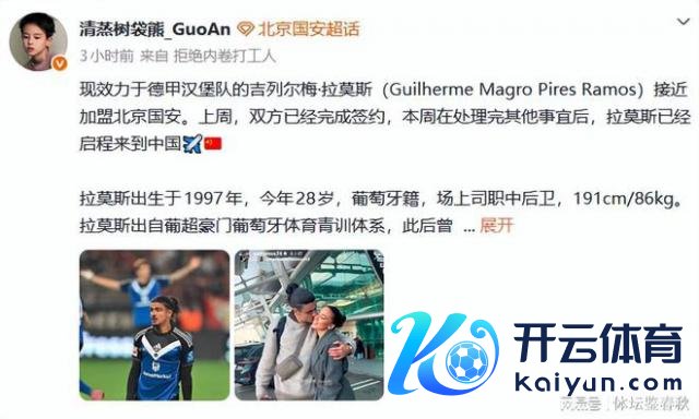 好饭不怕晚,国安本年冬季转会窗引进的第一个新外助终于敲定下来。据一位资深北京体育博主显现,就在上周末,俱乐部仍是悄然完成署名手续,来自德甲汉堡队的中后卫吉列尔梅 · 拉莫斯肃穆成为国安一员。这名葡萄牙中卫已在本周起程飞往中国。如果一切凯旋,他将不错顺利随队参加二阶段的泰国冬训。