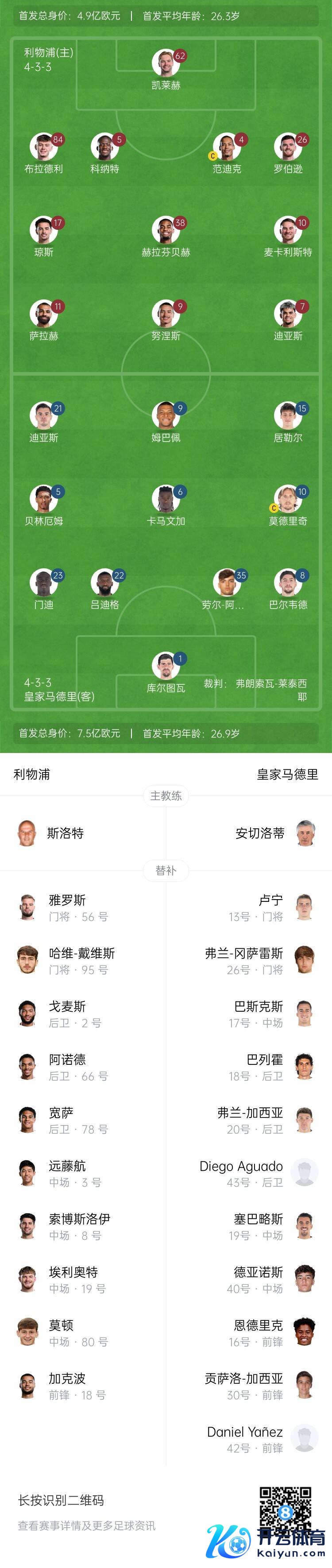 11月28日讯 欧冠联赛阶段第5轮,利物浦主场对阵皇马。赛前,官方公布了本场的首发名单,维尼修斯、琼阿梅尼伤缺。