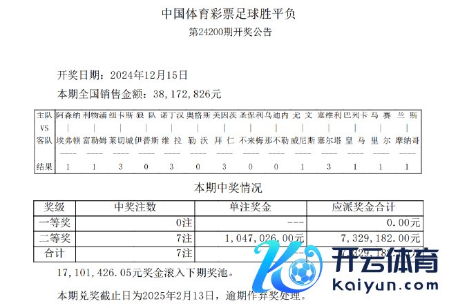 阿森纳0-0战平埃弗顿 体育录像/图片北京本领12月15日,赢输彩第24200期开奖揭晓。14场头奖空开,1710万滚存至第24201期竞猜;14场2等开出7注,单注奖金10.5万;任九开出159注,单注奖金10.5万。本期足彩销量为38,172,826元,任九投注总和为26,103,506元。 彩果方面,本期足彩冷门频出,仅6场比赛打出首赔,平局赛果多达6场,共8场赛果赔率在3倍以上。英超阿森纳0-0战平埃弗顿,爆出6.2倍冷门;利物浦2-2主场战平富勒姆,赛果赔率也超6倍。 本期足彩共打出...