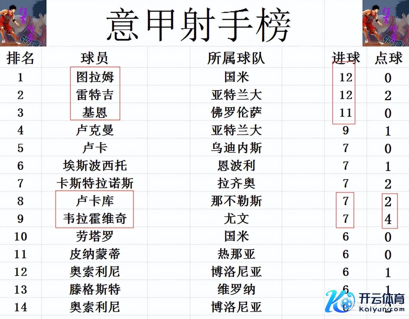 弓手榜方面体育录像/图片,图拉姆和雷特吉12球并排榜首,基恩今天进球被吹,如故1球之差排在第3。卢克曼9球位列第4,卢卡库今天传射立功,追上卢卡,韦拉霍维奇等东说念主7球并排第5。劳塔罗,奥索利尼等东说念主则是6球刚好拥入前十。