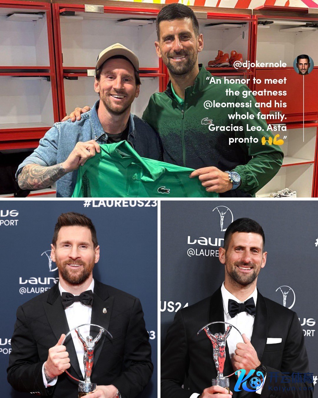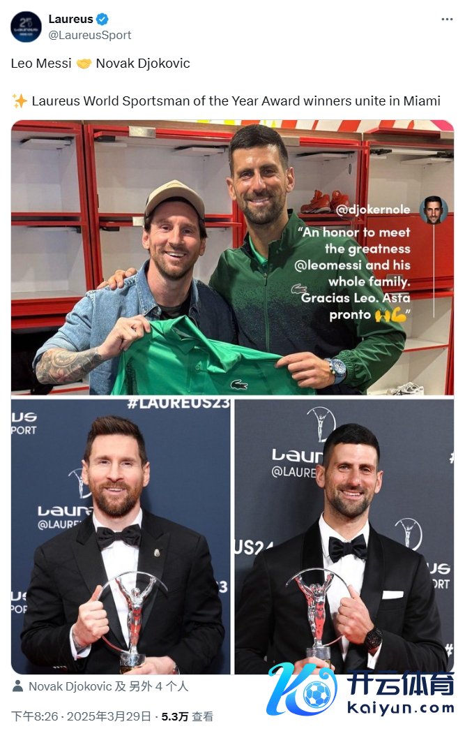劳伦斯奖官方而后晒出两东说念主的合影,并写说念:“里奥-梅西🤝诺瓦克-德约科维奇。✨两位劳伦斯年度最好须眉开发员奖得主集中在迈阿密。”