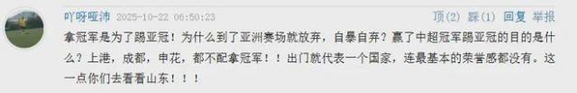 有球迷叱咤:"拿冠军是为了踢亚冠!为什么到了亚洲赛场就毁灭,自甘堕落?赢了中超冠军踢亚冠的标的是什么?海港、成都、申花,都不配拿冠军!外出就代表一个国度,连最基本的荣誉感都莫得。"
