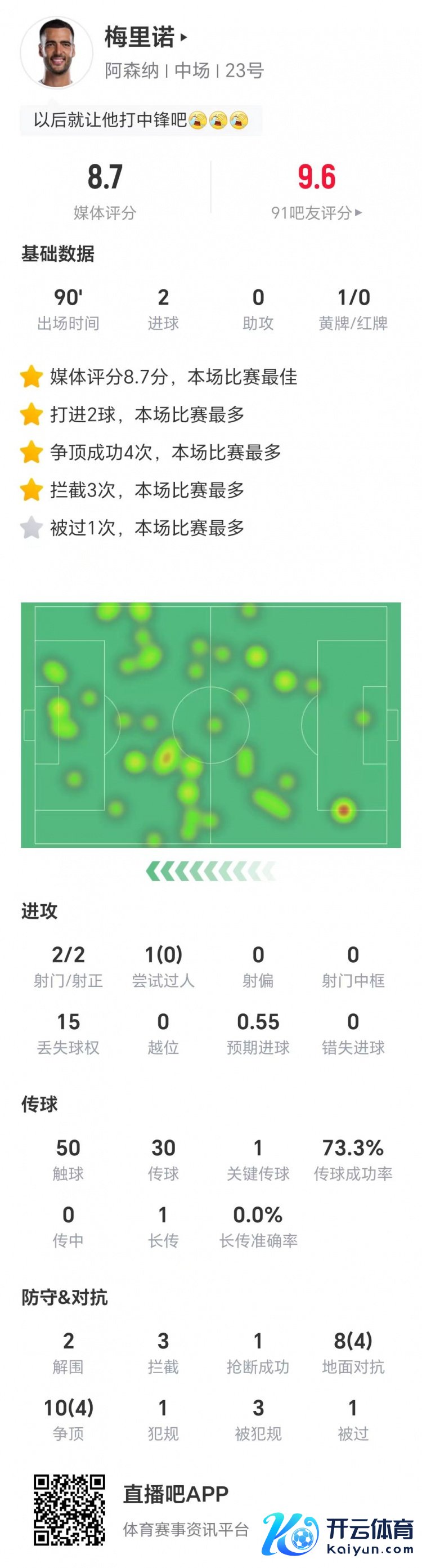 赛后时代统计数据泄漏,梅里诺本场比赛两射两正打进两球,1次要害传球体育赛事直播,两次突围,3次禁锢,1次告捷抢断,8次大地挣扎告捷4次,10次争顶告捷4次,获评8.7分。