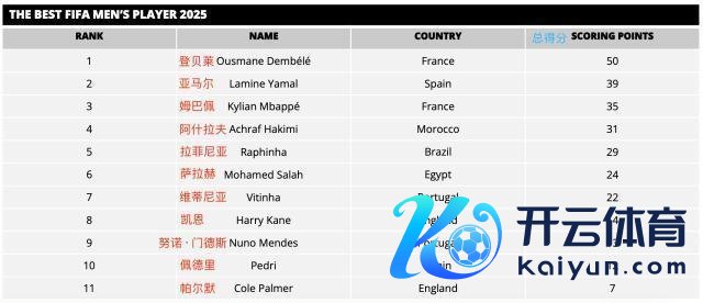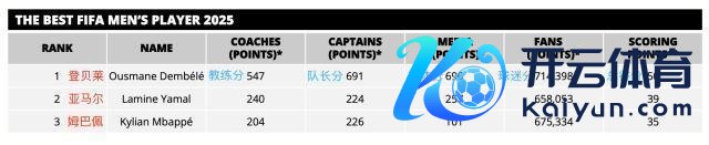 当地工夫周二晚间,海外足联在卡塔尔多哈举办行为,公布年度各大奖项得主。奥斯曼·登贝莱以50分荣膺2025年海外足联宇宙足球先生,比巴萨的亚马尔跨越11分,比皇马的姆巴佩跨越15分。