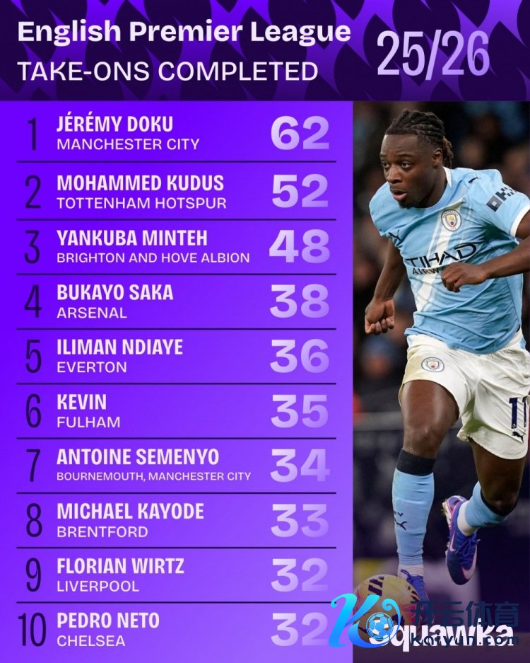 1月28日讯 Squawka统计了本赛季球员在英超的告捷过东谈主次数,比肩出榜单,多库62次告捷过东谈主居首。
