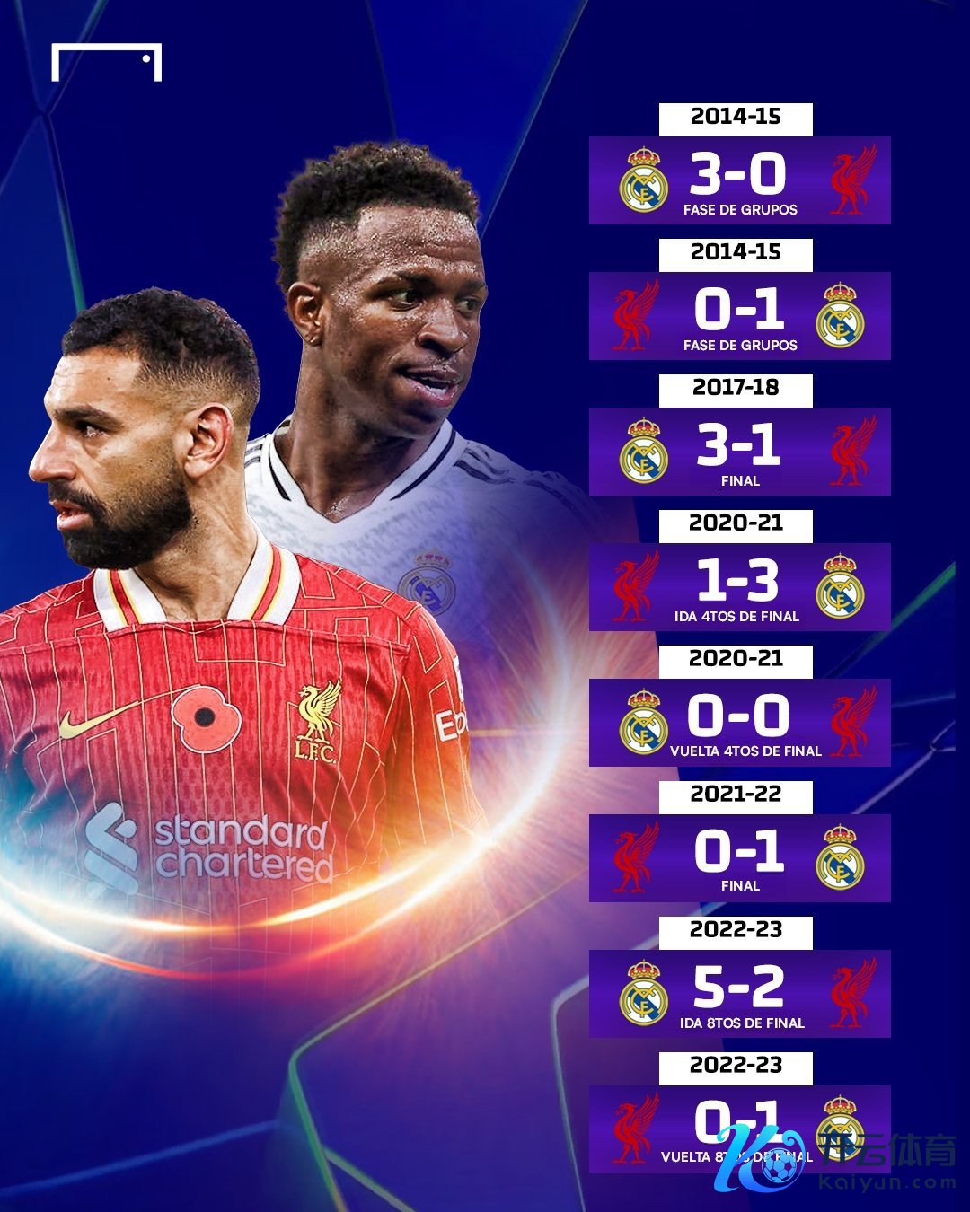 近8次对阵利物浦,皇马战绩7胜1平保捏不败,两场欧冠决赛利物浦均无缘夺冠。