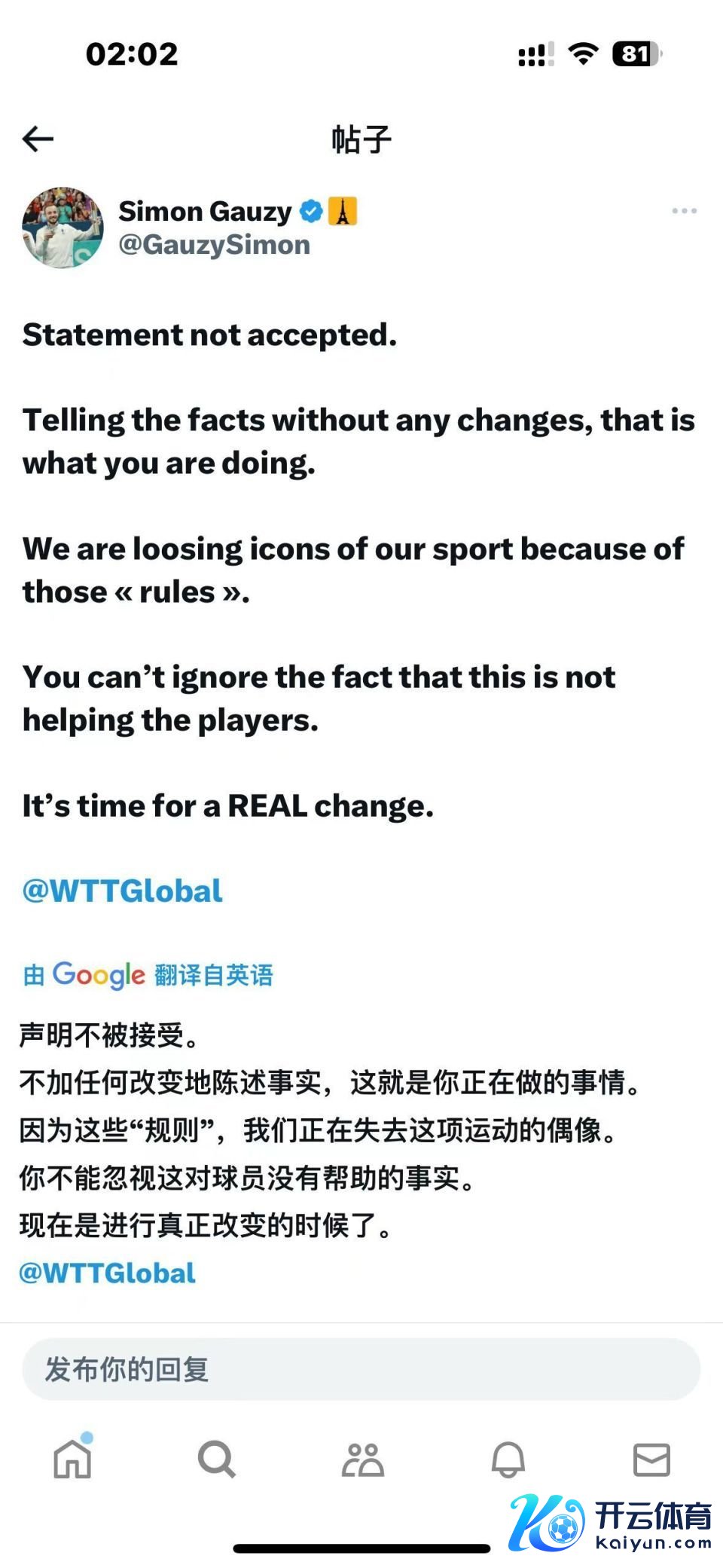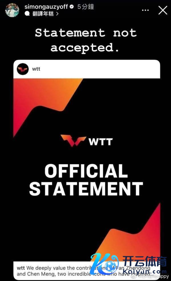 北京时辰12月29日体育赛事直播,法国乒乓球指令员西蒙-高茨更新社媒,暗示不采纳WTT的声明。
