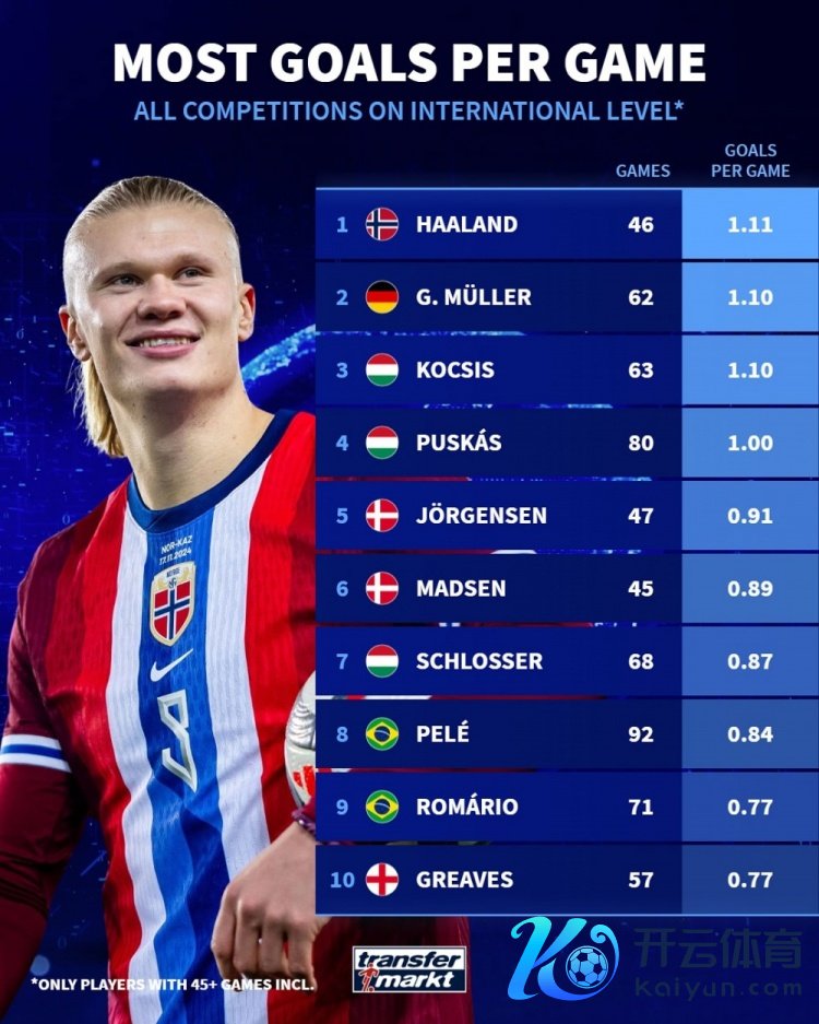 10月13日讯 德国转会商场统计了足坛历史球员在国度队的场均进球数目,比肩出榜单,哈兰德1.11球居首,盖德-穆勒、柯奇士次席。
