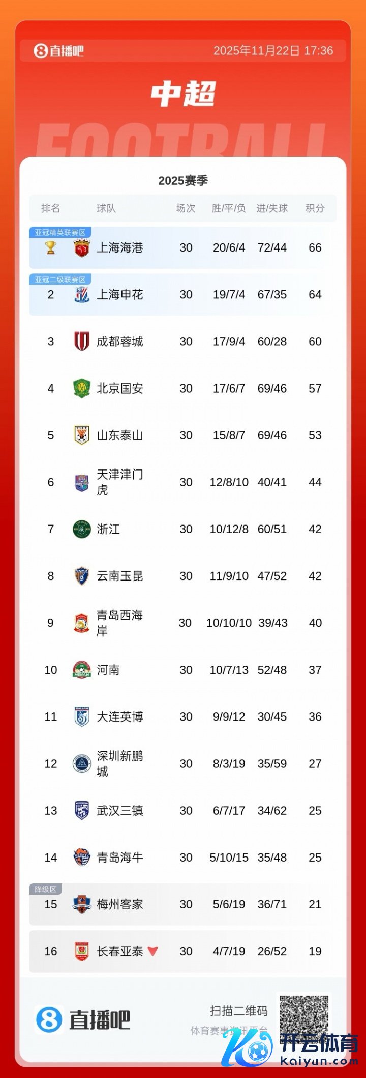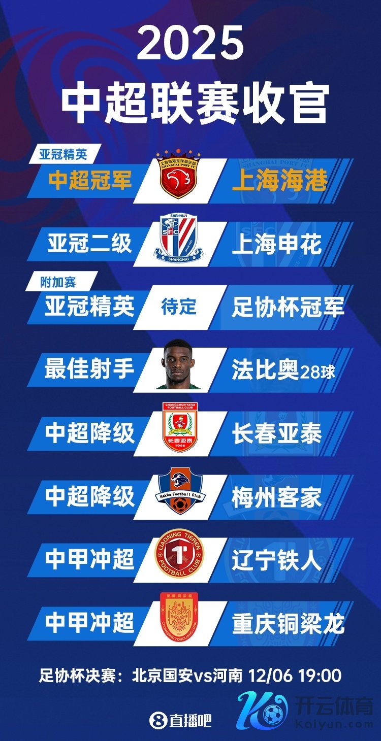 11月22日讯 2025赛季中超落下帷幕,上海海港贯串三个赛季夺得中超冠军,上海申花赢得亚军亚洲球盘网体育信息,蓉城获季军。长春亚泰和梅州客家降入中甲。法比奥28球夺得本赛季中超金靴奖。