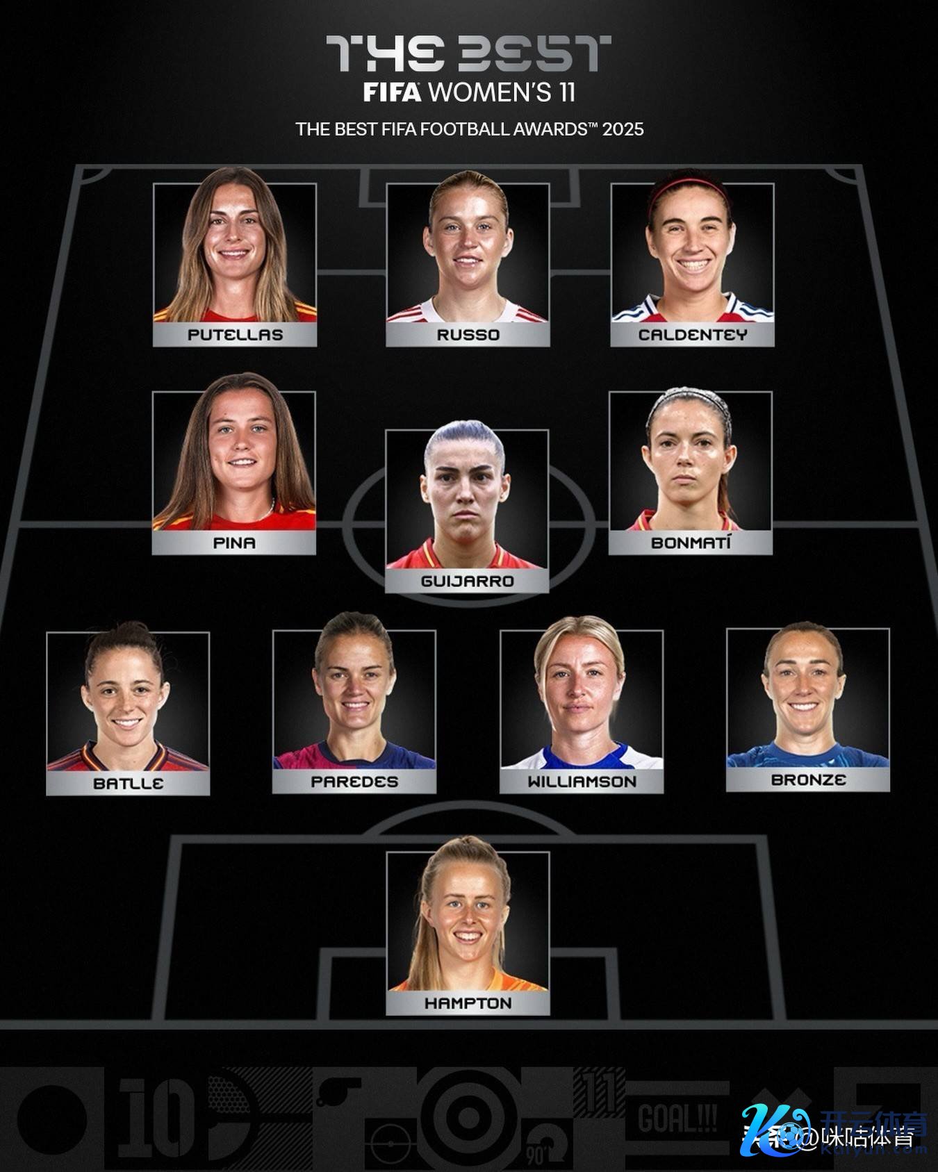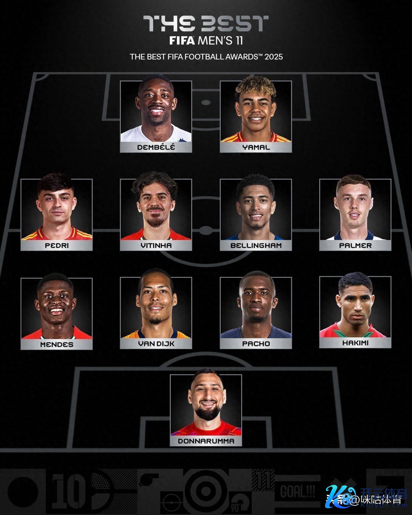 年度最好女子球员:邦马蒂年度最好男人门将:多纳鲁马年度最好女子门将:汉娜·汉普顿年度最好男足种植:恩里克年度最好女足种植:魏格曼普斯卡什奖:蒙铁尔玛塔奖:利兹贝斯·奥瓦列公说念竞赛奖:安德烈亚斯·哈拉斯·诺伊金最好球迷奖:扎霍体育俱乐部球迷男足最好气势:多纳鲁马、阿什拉夫、帕乔、范戴克、门德斯、帕尔默、贝林厄姆、维蒂尼亚、佩德里、亚马尔、登贝莱女足最好气势:汉娜·汉普顿、布隆泽、威廉森、帕雷德斯、巴特列、邦马蒂、吉哈罗、皮纳、鲁索、普特利亚斯、卡尔登泰