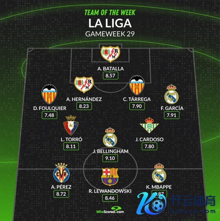 4月1日讯 WhoScored列出了西甲第29轮最好声势,莱万、姆巴佩、贝林厄姆、弗兰-加西亚在列。